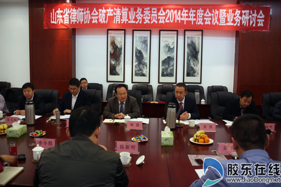 胶东在线网11月29日讯(见习记者 侯洪斌) 29日,山东省律师协会破产清算委员会在烟台海悦大厦召开2014年度年会暨业务研讨会,来自山东省、市两级共20余位知名律师与会,共同商讨十八届四中全会召开之后企业破产清算工作新的发展方向,并针对目前相关领域存在的疑难问题发表了自己的见解。
