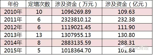 上图概述了各个年份的十大军工集团旗下上市公司定增的次数还有涉及的资金。不难发现,2010年和2013年定增的次数均超过十次,远高于以往的平均水平,但其涉及的运作资金仅在百亿左右。尽管2011年和2014年定增次数分别只有6次和8次,但11年募集资金超两百亿,14年更是接近三百亿,值得关注的是,2014年递交的资本运作成绩还是在成飞集成[2.89% 资金 研报]的158.47亿重组大单搁浅的情况下。明显发现,军工企业涉及的运作资金成快速增长趋势。15年已经走完四分之三,但无论在次数还是涉及资金额度上,军工企业定增注入资产的步伐均低于历史平均水准,不排除2016年甚至2015年第四季度有突然加速的可能。