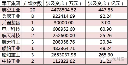 中航系一直是军工资产重组的排头兵,近年来其资本运作主要依靠定向增发后的优质资产注入。与此同时,节后的两个交易日,航天动力[1.66% 资金 研报]连收两个涨停,航天长峰[2.20% 资金 研报]累计涨幅近18%,市场资金的热捧或许预示着航天科工与航天科技[0.00% 资金 研报]集团有望扛起重组的大旗。小编总结了自2010年以来军工企业定向增发的活跃度,希望找寻到下一系列可能的重组标的“金矿”。