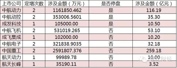 上图总结了各个军工集团近六年来定增次数和涉及资金金额。明显发现,中航工业集团是军工资产注入的聚集地,其旗下的19家上市公司完成了20次定向增发,注入优质航空资产高达448亿,占据总额的半壁江山。即使经过数年的整合,其资产证券化率目前也仅仅只有55%,与80%的承诺仍有距离。尽管成飞集成的重组遗憾搁浅,但中航系的初步资产整合已经略见端倪,此次三家公司同时停盘让市场产生了2.0版本的预期。外界广泛猜测,航空动力[4.04% 资金 研报]系统的“三驾马车”或许不再会进行单一的资产注入,原本各自奔跑的“野马”会被进一步的资源整合,打造高效完整的产业链条。