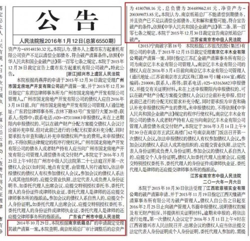 2016年1月12日,《人民法院报》刊登公告:南京纸箱总厂不能清偿到期债务,并且资产已不足以清偿全部债务,无和解和重整可能,符合宣告破产的条件。依照《中华人民共和国企业破产法》第二条、第一百零七条之规定,本院于2015年12月30日裁定宣告南京纸箱总厂破产!
