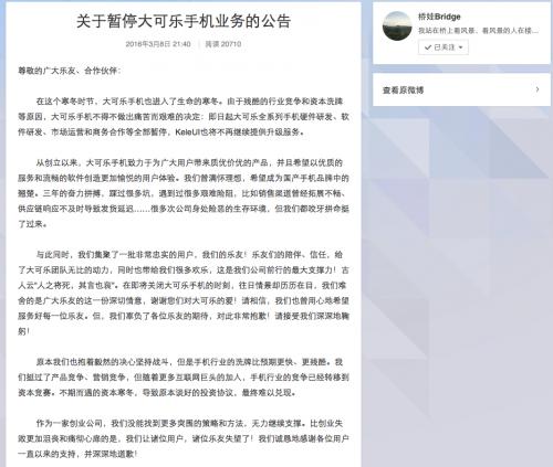 3月8日,大可乐手机所属的云辰科技有限公司发微博称暂停大可乐手机业务的公告,这意味着大可乐手机公司正式宣布倒闭。