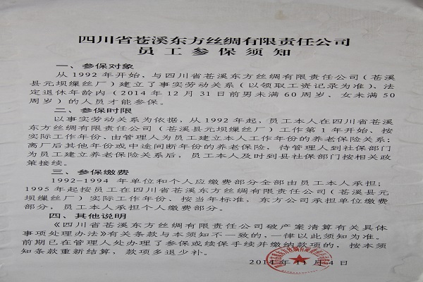 四川省苍溪东方丝绸有限责任公司于1997年由集体所有制企业改制而成,其前身苍溪县元坝缫丝厂。在上世纪八九十年代,该厂曾是当地的纳税大户、四川省的名星企业,鼎盛时期,员工达到1300多人。因丝绸行业受国际国内市场影响,加之经营管理不善,2003年起,全面停产。