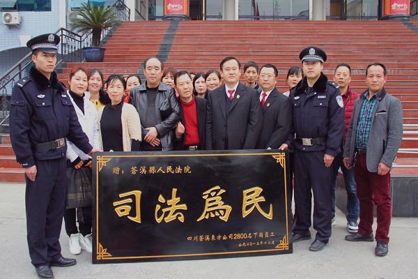 法制网3月28日讯(李治洪 彭孝林)2016年3月10日上午十时,在“中国雪梨之乡”四川省苍溪县县城的一条街道上,近百名群众簇拥着一面精制的上书着“司法为民”四个金黄大字的牌匾走向苍溪法院,街道两旁的路人被浩浩荡荡的队伍吸引,驻足观看。