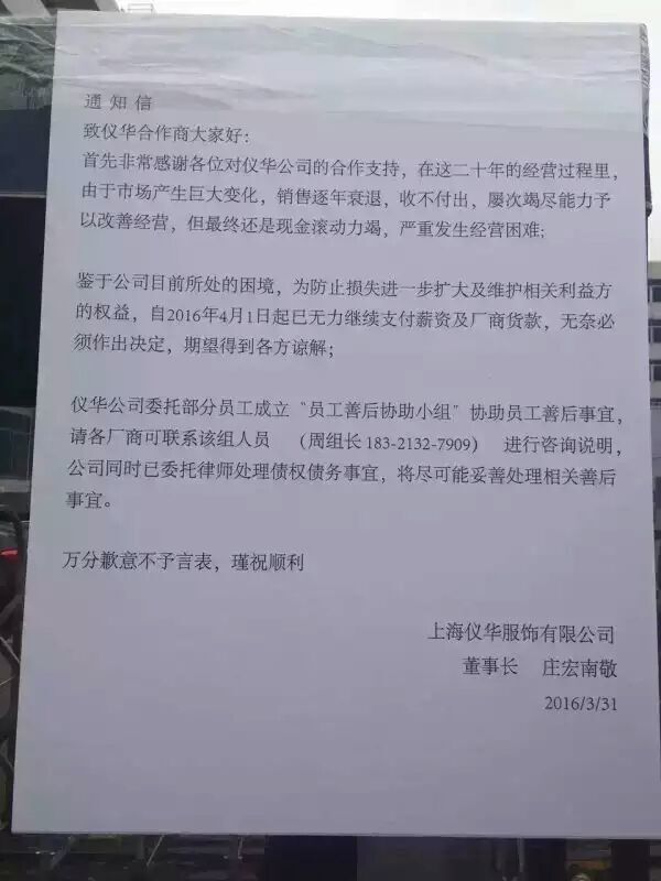 台湾仪大公司副总经理、上海仪华服饰有限公司董事长庄宏南在对外发布的公开信中表示,由于市场产生重大变化,销售逐年衰退,收不付出,屡次竭尽能力改善经营,终因资金链断裂,严重发生经营困难,在无力支付员工薪资及厂商货款的情况下,不得己做出停产倒闭的决定。