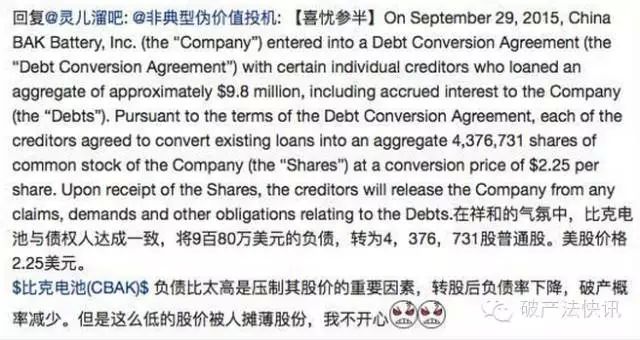 这是比较难以回答的问题。我先展示一个我近期经历的一个例子。美股比克电池去年10月5日盘后宣布,达成债务协议。