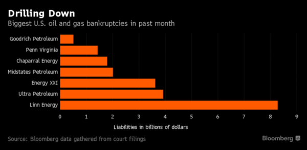 自2015年至上周,有130家北美石油和天然气生产商和服务公司申请破产,总债务金额高达440亿美元。