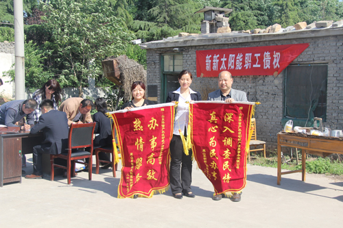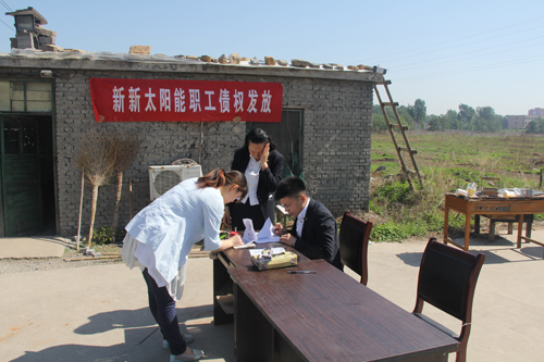 山东新新太阳能科技发展有限公司破产财产分配方案在第三次债权人会议表决通过并经法裁定后,管理人(山东华信产权流动破产清算事务有限公司)于2016年5月17日在原企业厂区内开展了职工债权发放工作。63名职工领到拖欠了他们5年之久的工资等款项,情绪十分激动。为表达他们的心意,由职工代表分别向管理人和平阴县人民法院送上感谢信并受了锦旗。