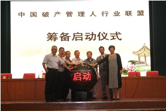 现场由发起单位代表北京大成律师事务所池伟宏、安永会计师事务所顾智浩、山东华信清算重组集团公司提瑞婷、中欣重组顾问(北京)有限公司王欣新、瑞盘投资管理北京有限公司马骥、温州破产管理人协会项军权,还特别邀请中国银行法学研究会会长王卫国教授,按下启动球,正式宣布中国破产管理人行业联盟筹备委员会成立。