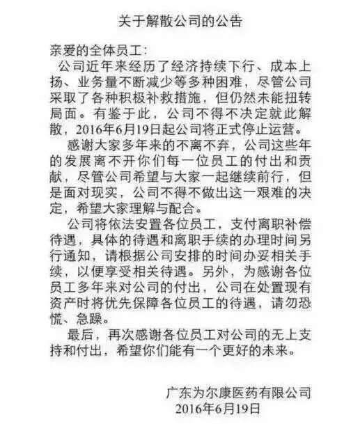 6月19日,为尔康发布在其官网上发布了“关于解散公司”的公告。公告称,其近年来经历了经济持续下行、成本上扬、业务量不断减少等多种困难,尽管公司采取了各种积极补救措施,但仍然未能扭转局面。有鉴于此,公司不得不决定就此解散,2016年6月19日起正式停止运营。