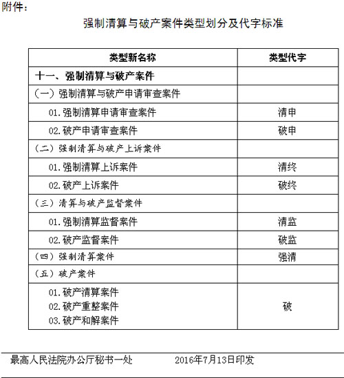 为满足强制清算、破产案件的审判工作需要,根据《最高人民法院关于人民法院案件案号的若干规定》第七条、第十四条条规定,决定对强制清算、破产案件类型单独分类(详见附件《强制清算与破产案件类型及代字标准》)。现将调整内容及有关事项通知如下: