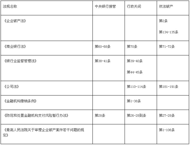 从下表中可以发现,一方面,我国涉及银行破产的法律法规已经为数不少,这是值得欣慰的;但另一方面,这些法律法规却杂乱无章,整体呈现出一种无序的状态。没有一部法律能实现对涉及破产相关制度如破产申请人、管理人、破产标准、债权申报、破产清算等的全部涵渉,而是分散于等级不同的法律、法规中,这不但可能产生法规间的冲突,更可能会导致适用时的随意。