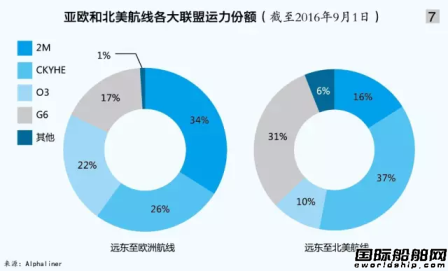 为应对超大型集装箱船的发展和低迷的市场,班轮运输业越来越朝着联盟合作方向发展。截至9月1日,韩进海运所属CKYHE在亚欧航线上所占市场份额为26%,其中韩进海运所占市场份额为5.67%;在北美航线所占市场份额为37%,其中韩进海运所占市场份额为7.37%(见图7)。可以看出,这两条主干航线也是韩进海运的主要航线。目前,随着韩进海运进入破产保护程序,CKYHE其余各方均发布相关应对方案。在合作航线方面,各方均宣布即时终止与韩进海运的换舱合作,并已发布替代服务,然而初始时期的混乱一定存在,对于客户而言必然意味着极大的不方便。对于已经装在韩进海运经营船舶的在途货物,联盟各方也出台相关措施,表示将密切跟踪货物动态,与韩进海运、当地码头等保持密切的沟通,想方设法安排货物安全、尽早抵达目的地,竭尽全力将可能造成的运输阻滞降到最低。显然,对于CKYHE而言,韩进海运的破产对于联盟的品牌、声誉将造成影响和伤害,蒙受巨大的经济损失,及面临未来尚不可知的法律风险。