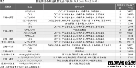 实际上,除了联盟方的合作之外,现今的大型班轮公司已经在各方航线上与其他班轮公司形成错综复杂的合作关系,韩进海运同样如此。根据德鲁里海事研究数据(见表5),韩进海运在申请破产保护之前,在各条航线上的合作伙伴多达13家,主要涉及CKYHE、O3及G6三大联盟成员。可以想象,韩进海运申请破产保护,对合作方都将产生连锁反应和各种风险。