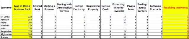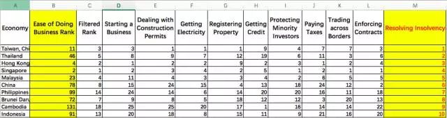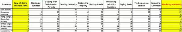 10月26日,世界银行(WB)发布了最新的《全球营商环境报告》(Doing Business)。《全球营商环境报告》对全球190个经济体根据营商便利度按1到190进行了排名。排名越高表示监管环境更有利于开启和运营一家本地企业。综合排名是根据10个议题的前沿距离分数决定。每一个议题有一样的权重并且包括多个指标。破产处理便为考量因素之一。