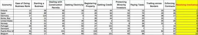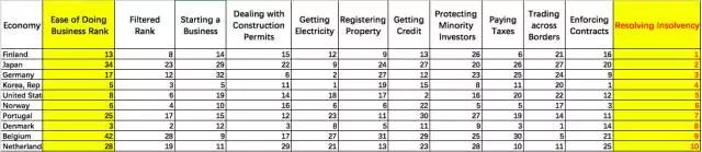 由此可以看出,新西兰虽然在营商环境便利度上排名第一,但在“破产处理”这一项目上排名第34位。在“破产处理”这一项取得第一名的是芬兰,尽管其整体排名未进入前十名,位列第13。相反,日本在营商环境便利度上排名第34位,但是其在“破产处理”上却位列第2。