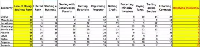 欧洲和中亚地区“破产处理”项目排名前十名情况如下: