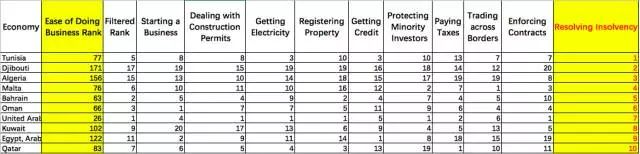中东及北非地区“破产处理”项目排名前十名情况如下: