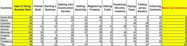 拉丁美洲及加勒比海地区“破产处理”项目排名前十名情况如下: