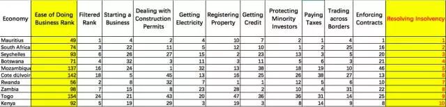 撒哈拉以南非洲“破产处理”项目排名前十名情况如下: