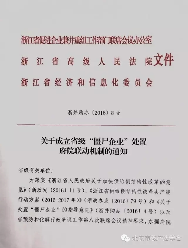 为落实《浙江省人民政府关于加快供给侧结构性改革的意见》(浙政发〔2016〕11号)、《浙江省供给侧结构性改革去产能行动方案(2016-2017年)》(浙政办发〔2016〕79号)和《关于处置“僵尸企业”的指导意见》(浙并购办〔2016〕4号)以及省预防和化解行政争议工作第八次联席会议精神要求,加强府院联动,积极稳妥推进“僵尸企业”处置工作,建立省级“僵尸企业”处置府院联动机制(以下简称府院联动机制)。