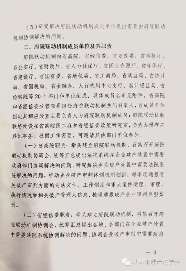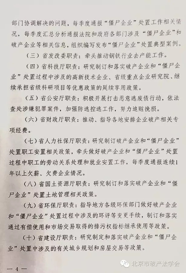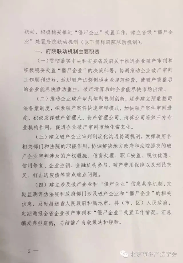(二)省经信委职责:牵头建立府院联动机制,召集召开府院联动机制协调会,统筹汇总提出各地、各部门在企业破产处置中需要法院系统协调解决的问题,协调企业破产审判中需要政府部门协调解决的问题,每季度通报“僵尸企业”处置工作相关情况,每季度汇总分析通报法院和政府各部门涉及“僵尸企业”和破产企业等相关信息,组织编写发布“僵尸企业”处置典型案例。