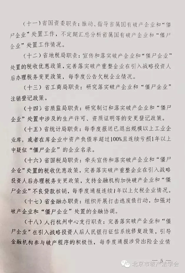 (十六)省国税局职责:牵头宣传和落实破产企业和“僵尸企业”处置的税收优惠政策,完善落实破产重整企业在引入战略投资人后办理税务变更政策,支持金融机构加快破产企业和“僵尸企业”不良贷款核销,每季度通报连续1年以上欠税企业情况。