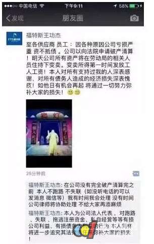 2017年元旦刚过,1月4日晚上8点44分,中山市福特斯照明有限公司(以下简称“福特斯”)法人代表王功杰在个人的微信朋友圈宣布福特斯因各种原因亏损严重,资不抵债,已向法院申请破产清算!并表示,不会跑路,不失联。并将公司所有资产变卖的所得第一时间发放工人工资。