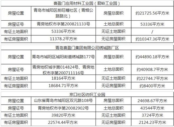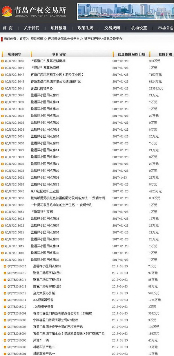 青岛产权交易所发布公告显示,青岛喜盈门集团有限公司管理人持有的44条资产记录,挂牌价格约4.52亿元,内含购物中心1处、工业园及厂区3处、设备、房产、车辆、商标、股份、专利等等。详情如下: