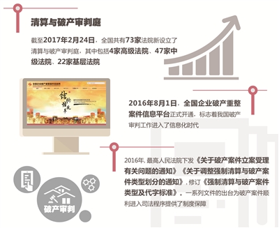 据统计,截至2017年2月24日,全国共有73家法院新设立了清算与破产审判庭,其中包括4家高级法院、47家中级法院、22家基层法院。