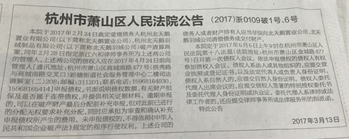 知名品牌企业北天鹅羽绒公司及北天鹅置业公司今日(3月15日)在《萧山日报》上登报,正式宣告破产。