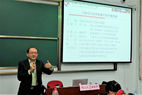 3月16日,上海交通大学凯原法学院破产法保护法研究中心主办的破产法专题讲座在徐汇校区工程馆114教室举办。此次讲座的主题是“实践中的破产管理人制度”,由浙江京衡律师事务所执行主任、浙江省律师协会企业破产管理专业委员会主任、凯原法学院破产保护法研究中心兼职副主任任一民律师主讲,新加坡国立大学法学院魏铭声教授担任与谈人。参加讲座的还有凯原法学院师生以及沪上部分破产法官、破产管理人等。中心主任韩长印教授主持讲座。