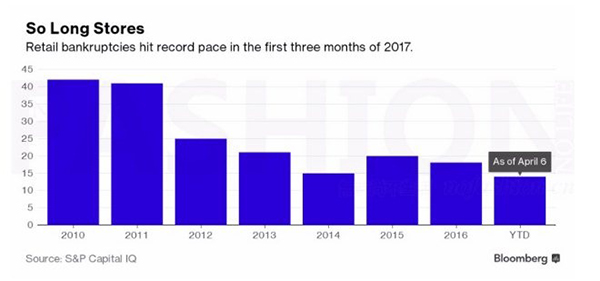 近两年,美国已经有Wet Seal Inc.、Aéropostale Inc. 和American Apparel LLC 等青少年服饰零售商破产,其中Wet Seal Inc. 和American Apparel LLC 都是短期内两次破产,而服装鞋履零售领域中BCBG MazAzria Group LLC、Limited Stores LLC 和Payless ShoeSource Inc. 等零售商都在今年内申请破产,目前正等待资产拍卖。