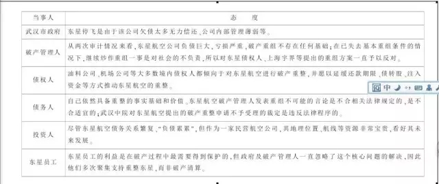 回顾整个事件,自2009年3月底被武汉中院宣布进入破产程序后,围绕东星航空资产到底是破产还是重组,破产管理人、债权人和其他投资方轮番角力。破产管理人、东星航空留守者以及多家破产重整申请人各执一词的“口水仗”愈演愈烈,以至于7月28日湖北省高级人民法院召开的论证会,成为一场激辩。(各方态度如下表)