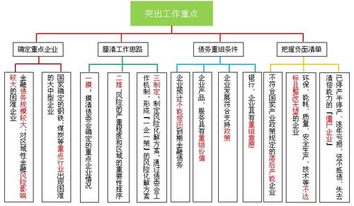 一、突出工作重点。各银行业金融机构应将金融债务规模较大、对区域性金融风险影响较大的困难企业,或者是国家确定的钢铁、煤炭等重点行业出现困难的大中型企业作为债委会工作重点。各银监局、各银行业金融机构要尽快摸清规模较大的困难企业的经营情况、资产负债情况及风险底数,按照风险的严重程度和区域的重要性进行排序,通过债委会工作机制,识别和判断企业风险,按照“一企一策”的原则制定风险化解方案。