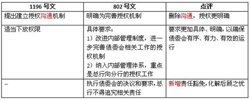 802号文具化授权要求,并新增责任豁免,该等机制的有效执行,能有效解决银行分支机构参与债委会的深度及执行债委会决议的力度和效率问题,提高不良资产债务重组的效率和成功率。