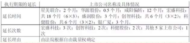 例如,星美联合以“为完成破产重整偿付债务,同时为顺利完成股权分置改革”为由向重庆市三中院提出延长执行期限的申请,为期两个月。盛润股份在执行重整计划时以“无法在重整计划规定的执行期间内完成股份清偿方案”为由向深圳市中院提交了延长重整计划执行期间的申请,为期三个月。[9]至于延长的期限和次数也是各不相同,法院自由裁量。例如,宏盛科技3次延长执行期间,每次6个月,共计18个月;创智科技公司两次延长执行期间,每次3个月,共计6个月;科健股份两次延长执行期间,每次3个月,共计6个月。总的来说,法院自由裁量,并无统一规定。