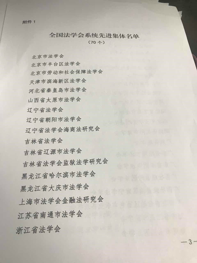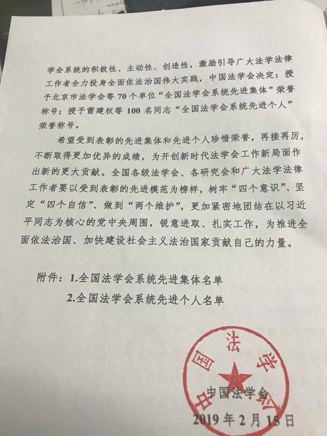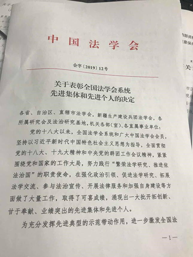 2019年3月19日-20日,中国法学会第八次全国会员代表大会在北京召开。习近平、李克强、栗战书、王沪宁等党和国家领导人到会祝贺。会议表彰2018年全国法学会系统先进集体和先进个人,山东省法学会企业破产与重组研究会被授予全国法学会系统先进集体荣誉称号。