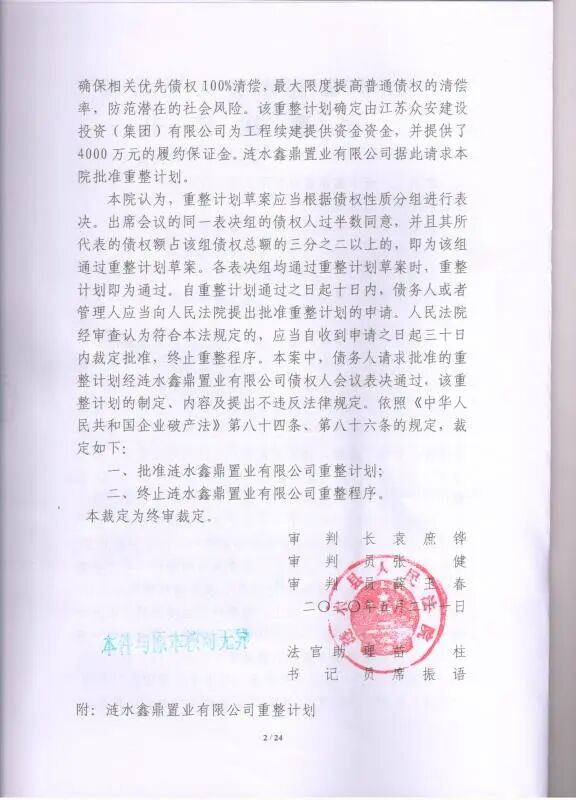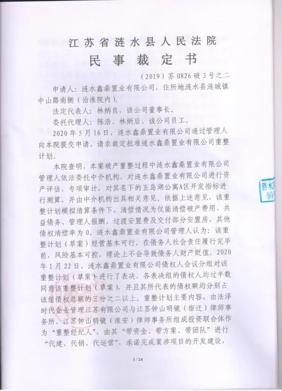 此次,法泽时代企业管理江苏有限公司联合江苏钟山明镜(宿迁)律师事务所、江苏钟山明镜(淮安)律师事务所作为重整经纪人,介入涟水鑫鼎置业有限公司破产重整案件,提出“带资金、带方案、带团队”对鑫鼎置业实行“代建、代销、代运营”的重整设想,得到了债权人、债务人、包括管理人、法院在内的各方的支持。2020年5月21日,涟水县人民法院作出(2019)苏0826破3号之二民事裁定书,裁定批准由重整经纪人主导实施的鑫鼎置业重整计划,这也是全国首例披露重整经纪人信息的裁定,对重整经纪人这一概念的普及将具有非凡的意义。