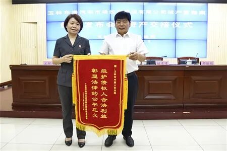 2020年6月,玉林中院召开新闻发布会,向社会通报玉林市法院破产案件审理情况。会上,东港公司管理人向东港公司破产重整投资人代表移交部分资产。会后,债权人代表崇左农商行风控部主任农桂强向法官连声感谢,并向玉林中院赠送锦旗:“谢谢你们一直以来的辛苦付出,让我们的合法权益得到了有效维护。”