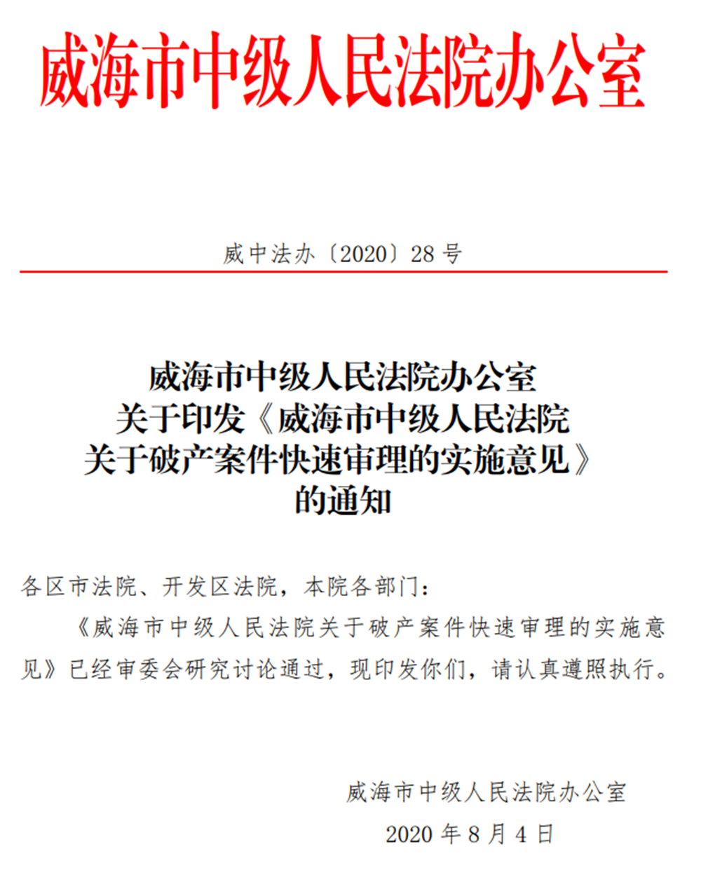近日,为提高破产审判效率,降低破产程序耗时、成本,提升债权回收率,增强服务优化营商环境能力,威海中院制定了《关于破产案件快速审理的实施意见》。