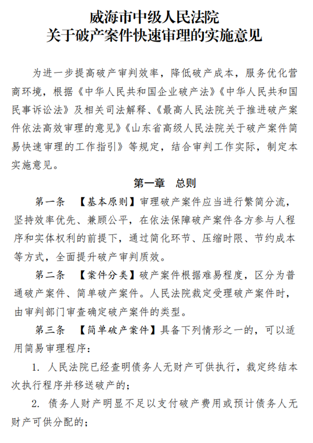 威海中院制定《关于破产案件快速审理的实施意见》