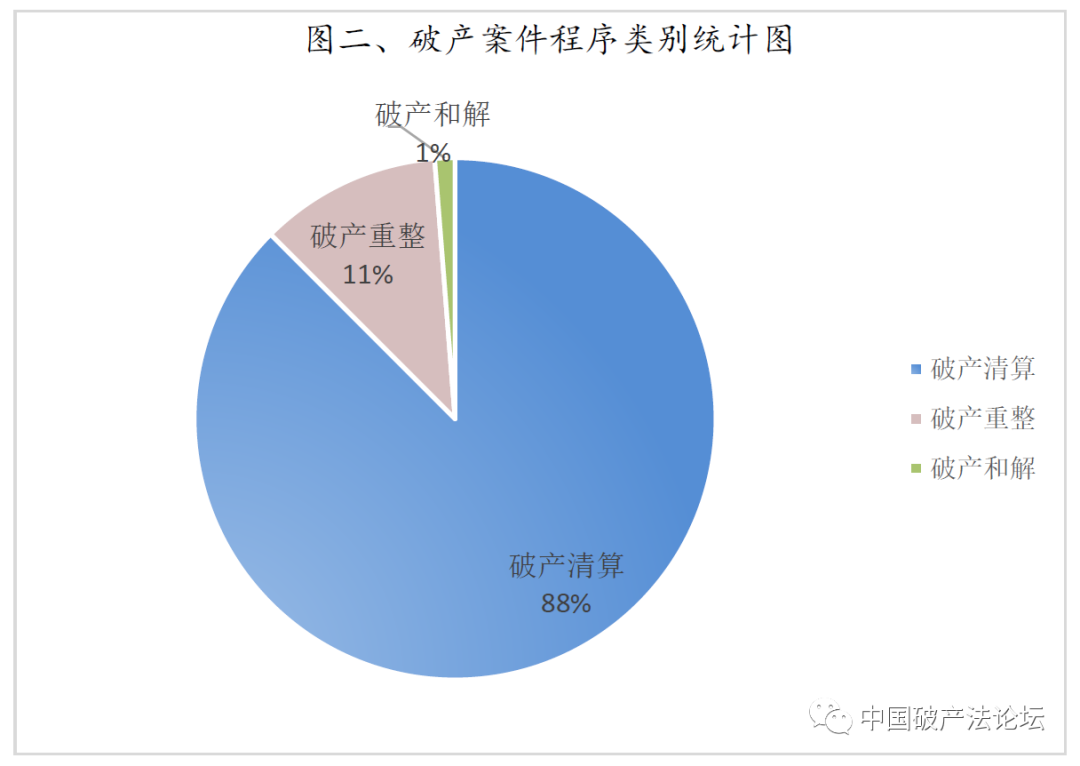 1.从程序类别来看,各债务人企业适用的程序多样,且以破产清算为主。其中,破产清算案件占比87.50%,重整案件占比11.25%,和解案件占比1.25%。