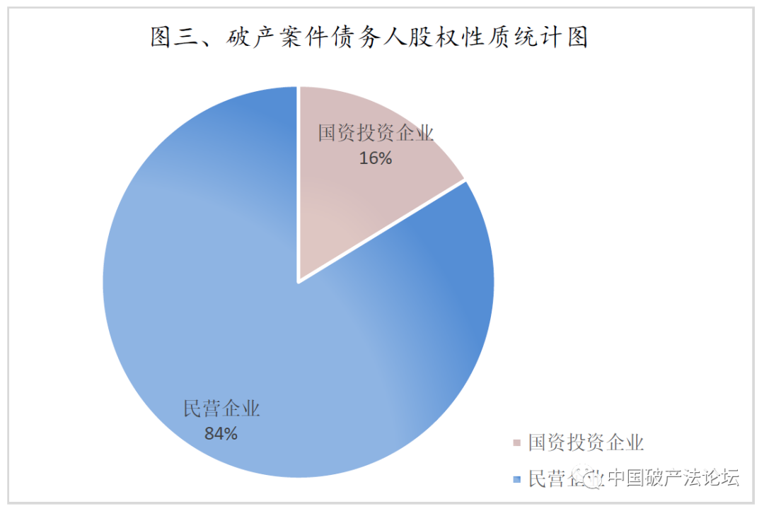 2.从股权性质来看,债务人企业中以民营企业为主,国资投资企业较少。其中,债务人为民营企业的占比83.75%,债务人为国资投资企业的占比16.25%。