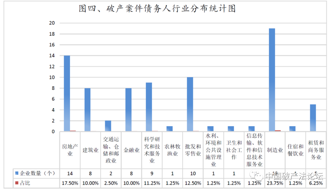 3.从行业分布来看,债务人企业中制造业企业和房地产企业较多。其中,债务人为制造业企业的占比23.75%,债务人为房地产企业的占比17.5%。