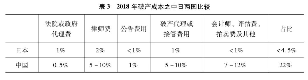 2.破产成本。破产成本是指破产相关费用占债务人财产的比重,破产费用包括法院费用、破产管理人费用、律师费用、评估和拍卖的费用以及其他相关费用。我国的破产成本约为破产企业财产的 22%,总成本包括法庭费用(0.5%)、律师费(5%-10%)、通知和公告费用(1%)、破产代理费(5%-10%)、会计师、评估师和其他专业人员费用(7%)、拍卖师费用(1%-5%)、服务提供者费用和/或政府收费(5%)。成本越高,就意味着有更大比例可用于债权人分配的财产被破产程序所占用,从而影响债务清偿率。我国办理1件破产案件的成本相当于破产资产价值的22%,多于日本的5倍,多于韩国近7倍。