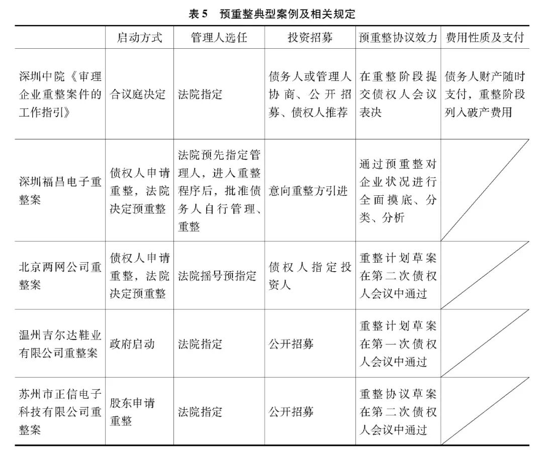 从我国深圳、北京、浙江、江苏等地的探索实践来看,多数预重整是作为重整的前置程序开展。在程序的主导者选任方面,上述典型案例中均是由法院选定管理人开展相关工作,对于如何衔接预重整和重整阶段的管理人问题也需进一步加以明确。关于预重整方案的效力问题,实践中通过进入重整程序,提交债权人会议决议确认效力。如果在法律层面事先确认预重整草案的效力,则预重整的效力会更强。从司法实践来看,对预重整的程序启动、适用范围、职能分工和程序终结,特别是规定预重整期间的中止执行效力和预重整方案对后续重整的法律效力,已经达成了诸多的实践共识,有必要在修改《企业破产法》或最高人民法院制定司法解释时加以明确。