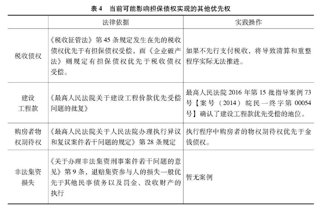 1.法律、司法解释要明确担保债权与其他优先权的关系。当前在已有担保物权制度的基础上,出现的其他类型、种类的权利是否处于优先权地位,例如税收债权、购房者物权期待权、拆迁安置户物权期待权、非法集资损失是否优先于担保债权,需要进一步明确,以保障担保物权的顺利实现。我们认为,基于我国现有的物权法、担保法等相关规定,以及各种生存权保障、投资损失考量的优先权在破产程序中应当劣后于担保物权;税收债权应在法定期限内申报,如果税收债权要获得优先受偿地位,就要建立起如同担保登记制度效果类似的公示制度,否则因为逾期申报,加之因行政关系产生的债权,将直接导致担保债权的落空。