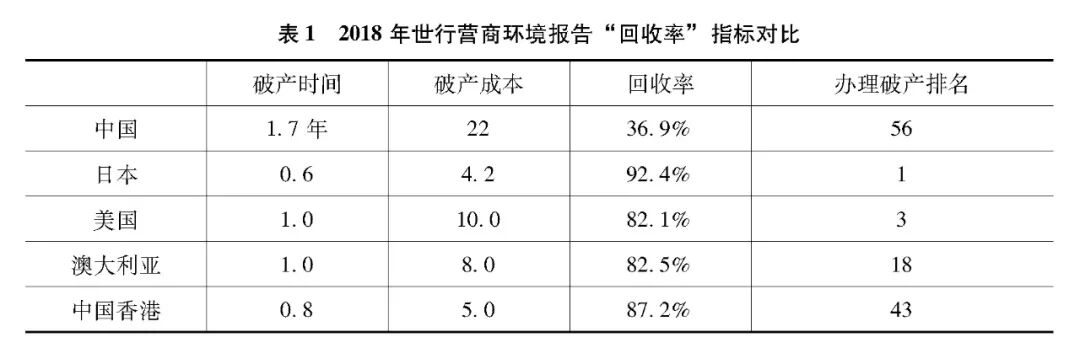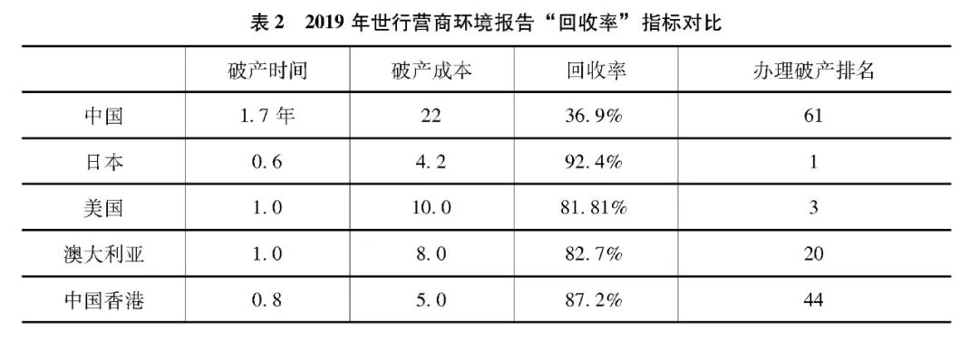 2019年营商环境报告中我国的“回收率”测算值是表现最好国家日本的1/3。世行环境评估从一个侧面反映我国营商环境的质量和水平,也为我国优化提升营商环境,尤其是债务清偿中运用实施破产制度,提供了完善优化的具体路径。