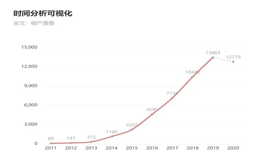笔者以关键词“破产重整”在Alpha案例库中进行检索,并选择时间分析可视化,得到下图所示数据。从图中可以看出,2011年至今,全国法院受理的破产重整案件呈快速上升趋势,尤其自2013年以后呈现翻倍增长态势。到2019年,全国法院共受理破产重整案件13463件,相较于2011年的89件增加了152倍之多。今年因疫情影响,不少企业出现经营困难,导致无法偿还债务。如何挽救危困企业?切实做好“六稳”和“六保”工作,任重道远。可以预见,未来几年,不少危困企业都会走上破产重整再生之路,但能否成功,除了需要债务人、债权人、法院和管理人的努力外,政府要在重整过程中给予积极帮助和支持。这就是本文要重点阐述的破产重整中府院联动机制的运用及提升问题。